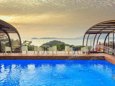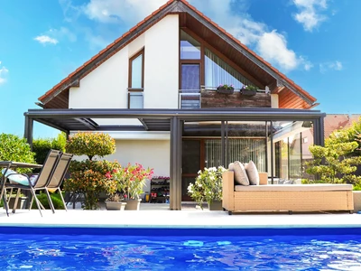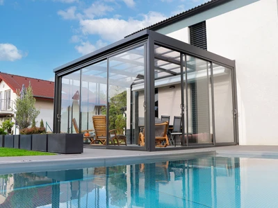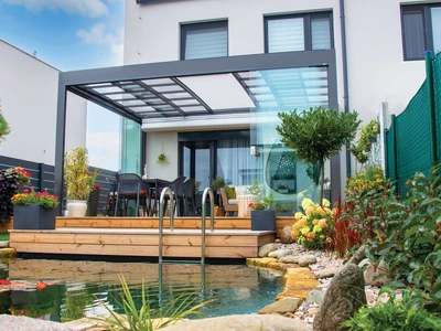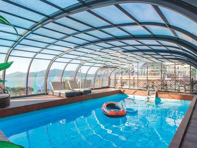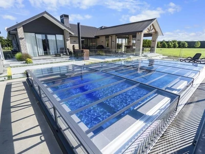 Zadaszenie basenu VIVA™ od Alukov to niskoprofilowe rozwiązanie z systemem jednej szyny, umożliwiające bezbarierowy dostęp z trzech stron. Nowoczesna konstrukcja chroni basen przed zabrudzeniami, przyspiesza nagrzewanie wody i utrzymuje jej temperaturę w nocy.
