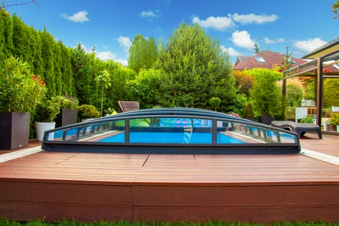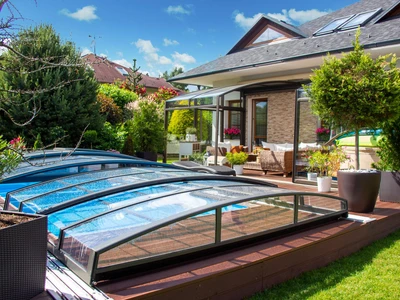 Zadaszenie basenu VIVA™ od Alukov to niskoprofilowe rozwiązanie z systemem jednej szyny, umożliwiające bezbarierowy dostęp z trzech stron. Nowoczesna konstrukcja chroni basen przed zabrudzeniami, przyspiesza nagrzewanie wody i utrzymuje jej temperaturę w nocy.