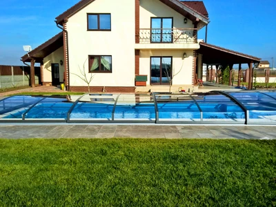 Zadaszenie basenu AZURE™ to rozwiązanie o średniej wysokości z eleganckim designem, bazujące na profilach aluminiowych o pojedynczym promieniu. Do wyboru wypełnienie z poliwęglanu jedno- lub wielościennego, dostępne w kolorze srebrnym lub antracytowym.