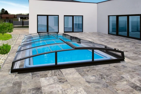 Zadaszenie basenu AZURE Flat to niskoprofilowe rozwiązanie o eleganckim wyglądzie, które harmonijnie wpisuje się w nowoczesne ogrody dzięki wielopromienistej konstrukcji. Zastosowano w nim wypełnienie z poliwęglanu jednokomorowego i ramę w kolorze srebrnym lub antracytowym.